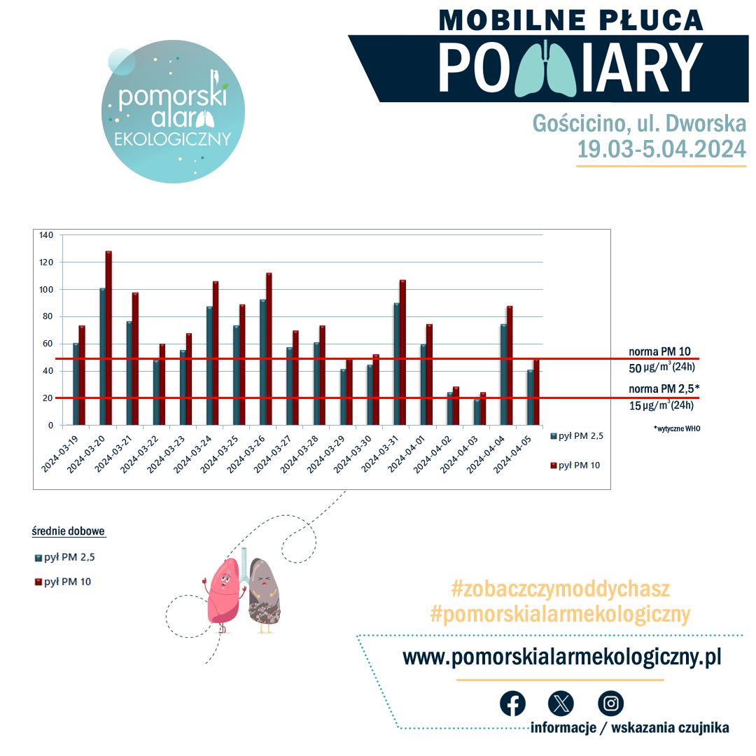 Poniżej znajdują się zapisy średniodobowych stężeń poziomów zanieczyszczeń pyłów PM 1, PM 2.5 i PM 10 pochodzące z czujnika zamontowanego na “mobilnych płucach”, które odnotowaliśmy w Gościcinie w okresie od 19.03 do 5.04.2024 r.
