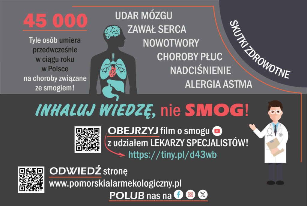 “Każdy oddech zanieczyszczonym powietrzem to krok w stronę poważnych problemów zdrowotnych.” – mówi Arkadiusz Szczygieł, prezes Pomorskiego Alarmu Ekologicznego. Zawał, udar, alergia, astma, nowotwór, schorzenia neurologiczne i wiele innych – mogą dotknąć każdego z nas. I dorosłego i dziecko. Podejmowanie działań w kierunku profilaktyki i na rzecz zmniejszenia zanieczyszczenia powietrza ma realny wpływ na zmniejszenie zachorowalności i umieralności w wyniku chorób i w efekcie podniesienie jakości i długości życia.”