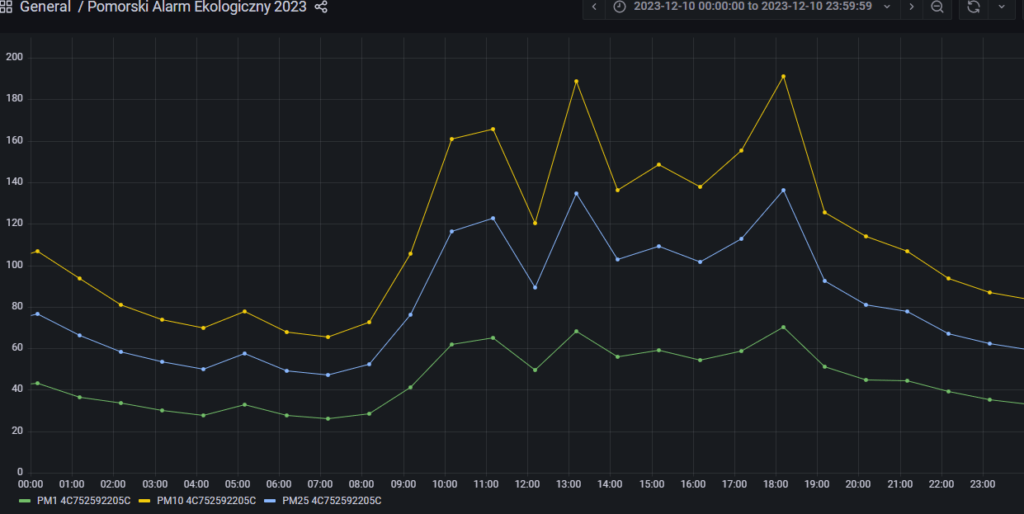 Na grafice poniżej pokazujemy wykres dobowego stężenia pyłu zawieszonego PM 10 w Gościcinie (odczyty godzinne, czujnik lookO2).