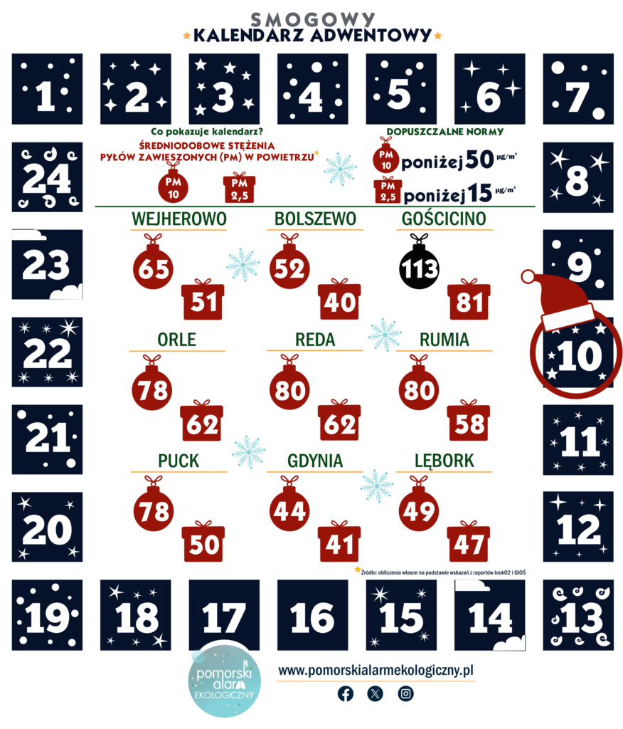 “Smogowy Kalendarz Adwentowy”, czyli codzienna publikacja wyników pomiarów zanieczyszczeń powietrza w 9 miejscowościach. Cel i zasady publikowania informacji w kalendarzu szczegółowo zostały opisane w artykule “Smogowy Kalendarz Adwentowy, czyli sprawdź z nami, co wisi w powietrzu i czym oddychamy!”. Zapraszamy do lektury 🙂