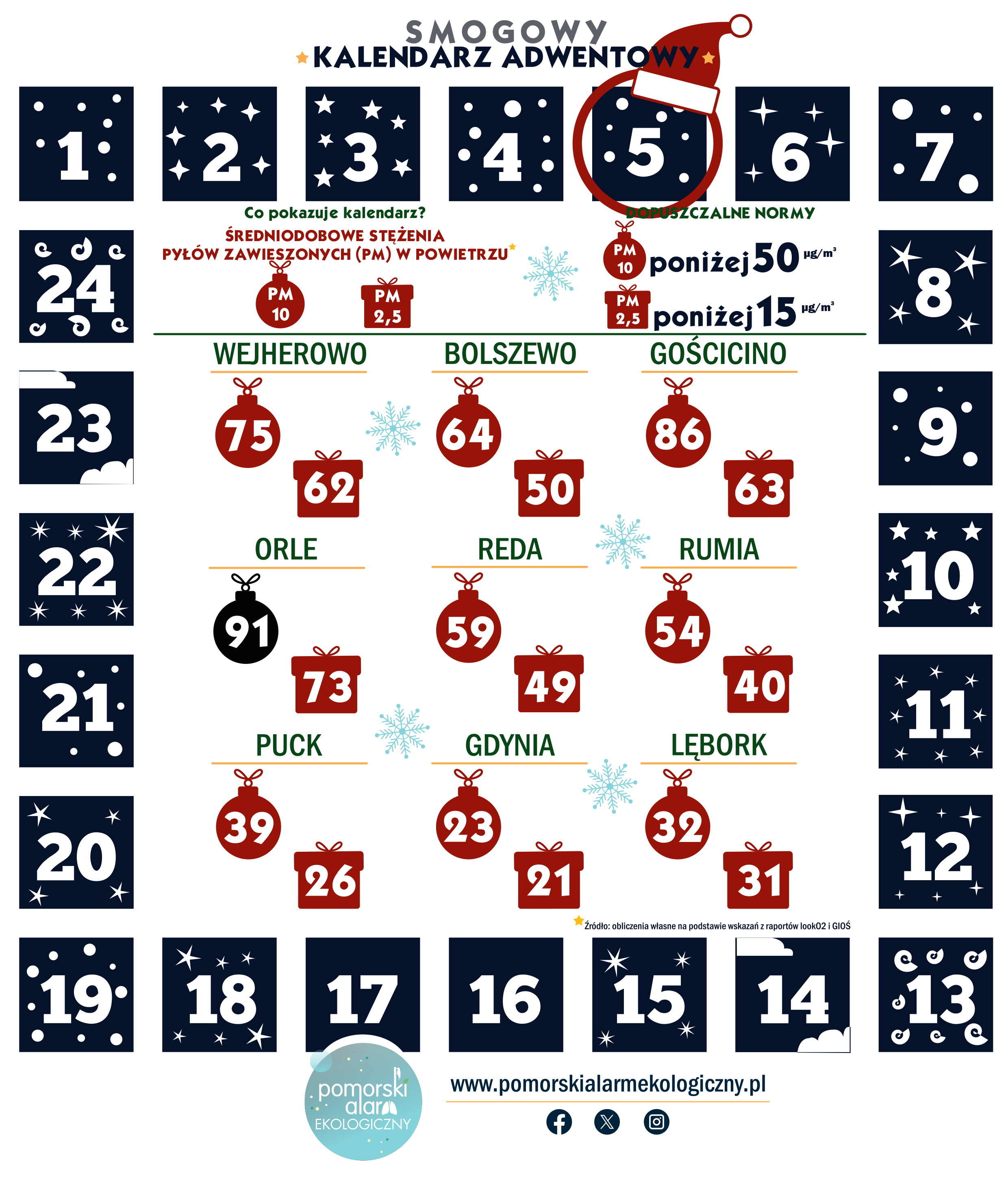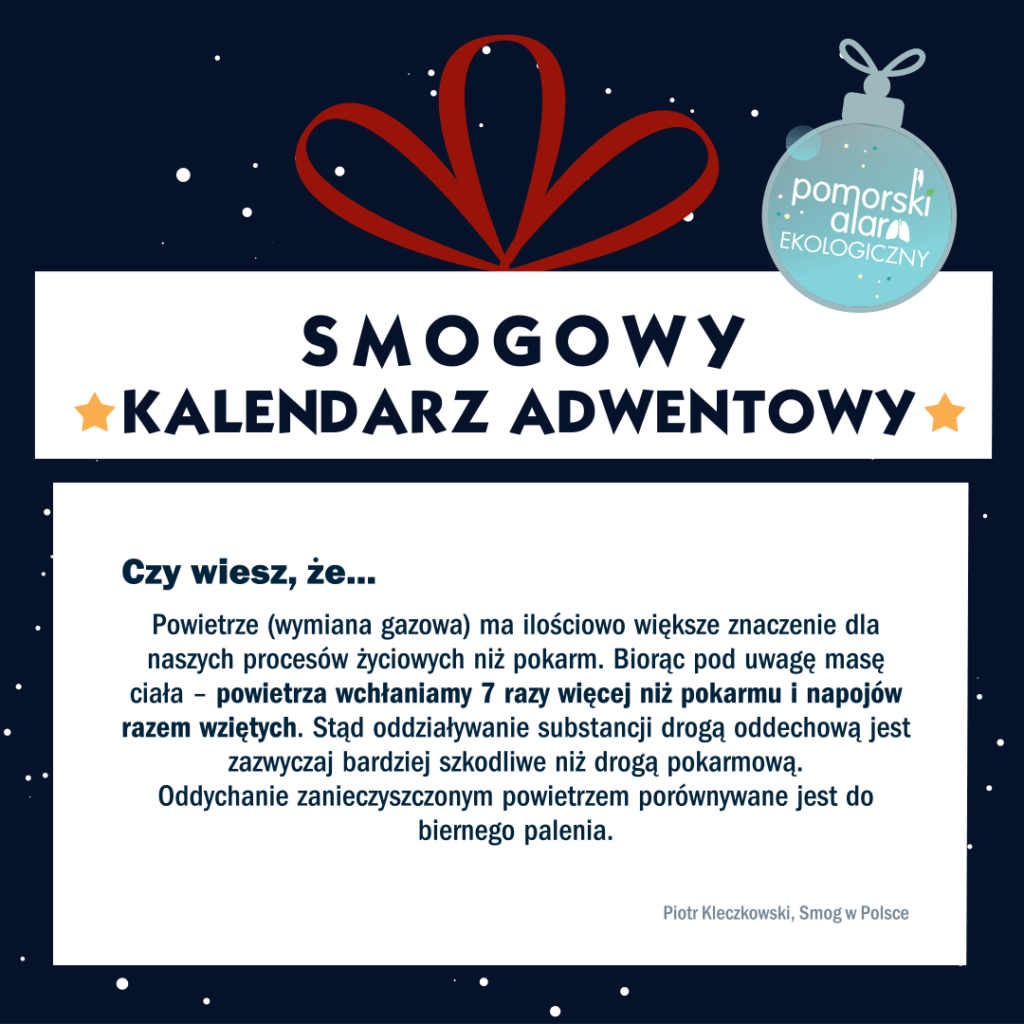 “Smogowy Kalendarz Adwentowy”, czyli codzienna publikacja wyników pomiarów zanieczyszczeń powietrza w 9 miejscowościach. Cel i zasady publikowania informacji w kalendarzu szczegółowo zostały opisane w artykule “Smogowy Kalendarz Adwentowy, czyli sprawdź z nami, co wisi w powietrzu i czym oddychamy!”. Zapraszamy do lektury 🙂